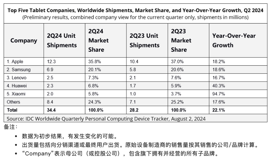 IDC 初步数据显示,2024 年第二季度全球平板电脑市场出货量为 3,440 万台,同比增长 22.1%。出货量排名前五的厂商依次是苹果、三星、联想、华为、小米。