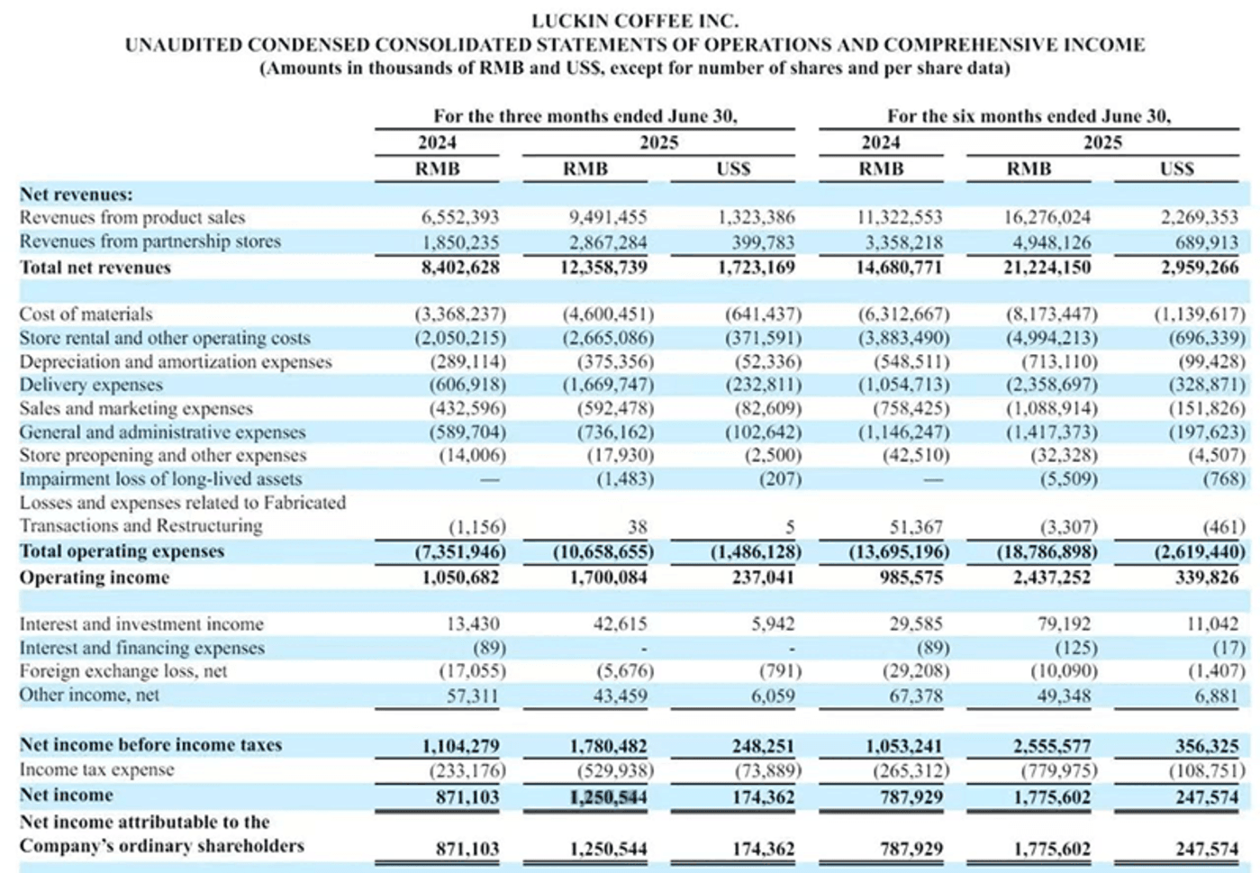 另外,据瑞幸咖啡公布的截至 2025 年 6 月 30 日的财报显示,上半年瑞幸咖啡总收入为 212.24 亿元 (约 29.59 亿美元),同比增长 44.6%;净利润则为 17.76 亿元,同比增长 125.4%。