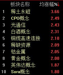 板块方面,CPO 概念、小金属、稀土永磁等纷纷大涨,智能电视、美容护理、氦气概念则表现不佳,领跌市场。