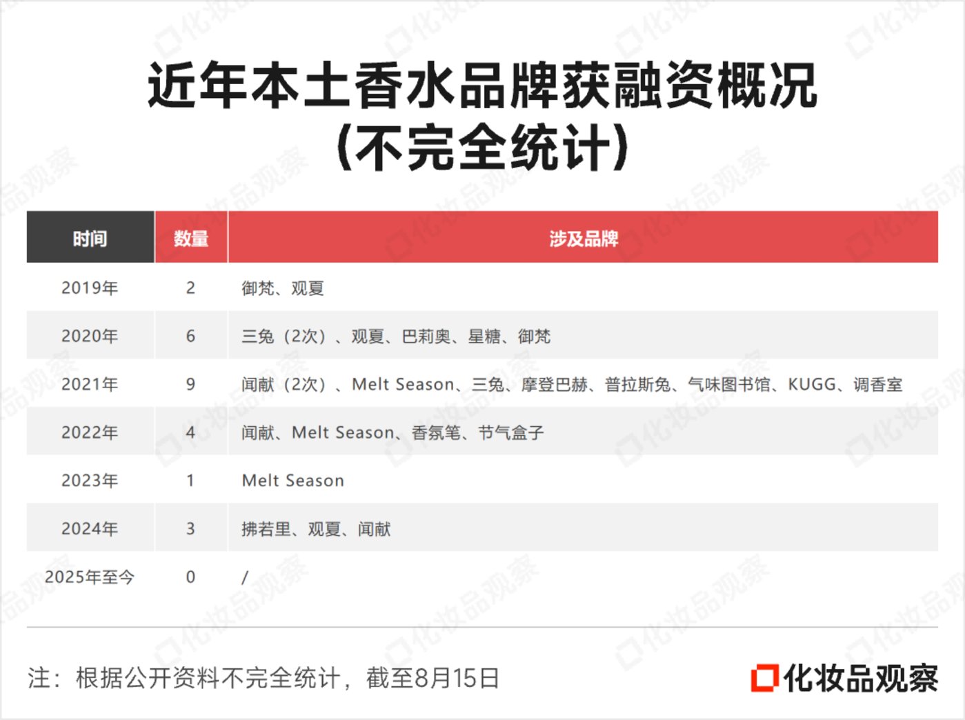 据 《化妆品观察》 不完全统计,本土香氛品牌在 2021 年获得的融资数达到顶峰,高达 9 起,闻献甚至在一年之内获得两起融资;此后融资数量骤减,2023 年仅有 Melt Season 获得资本青睐,而 2025 年至今,未有香氛品牌获投。种种迹象表明,资本退潮,回归冷静。
