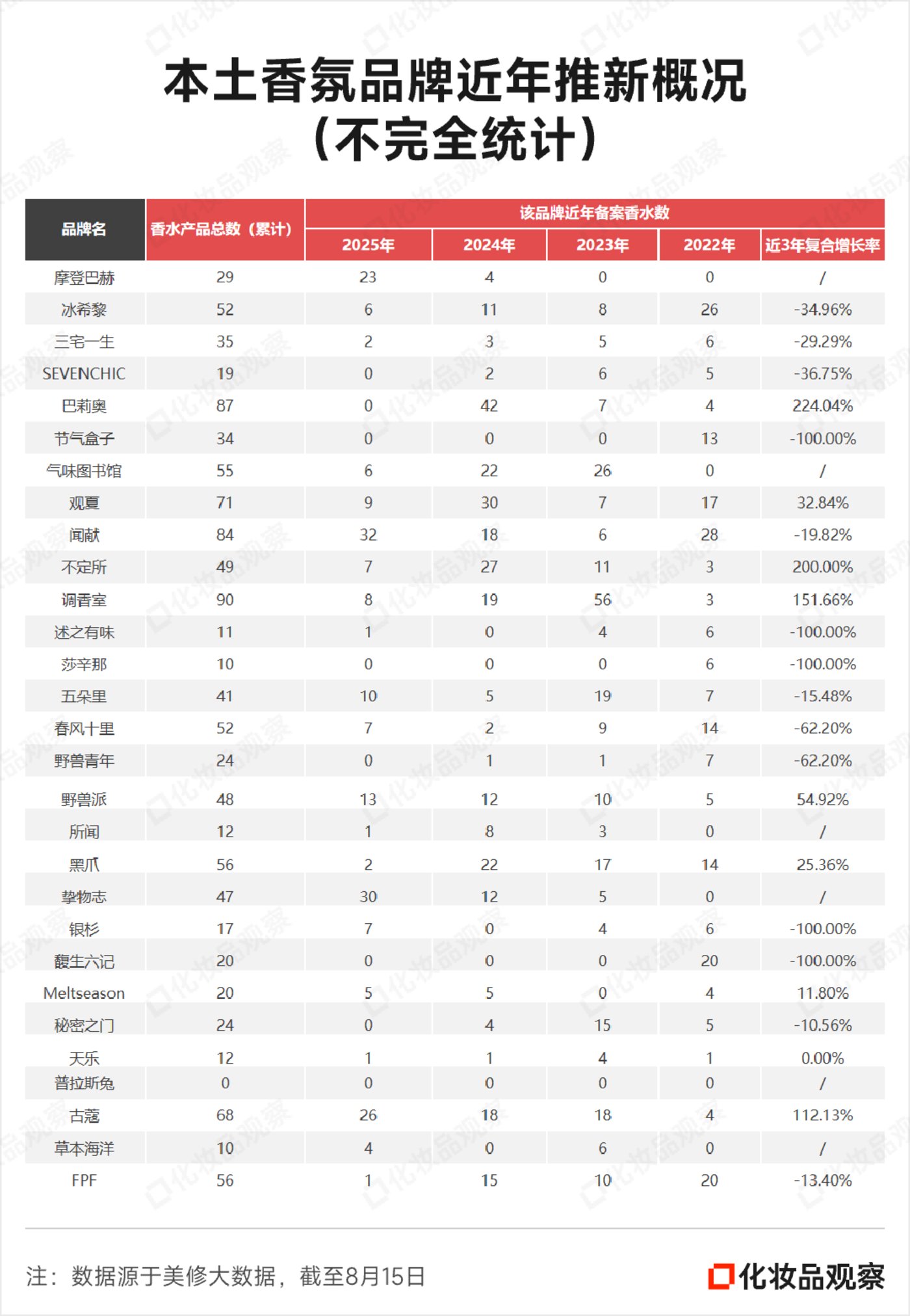 比如,闻献、观夏、Melt Season、调香室等品牌备案数近三年复合增长率均呈正增长态势,其中,不定所增速高达 200%。而今年以来,推新最多的是闻献,相关新品达 32 件,同比暴增 357%,超过去年全年。