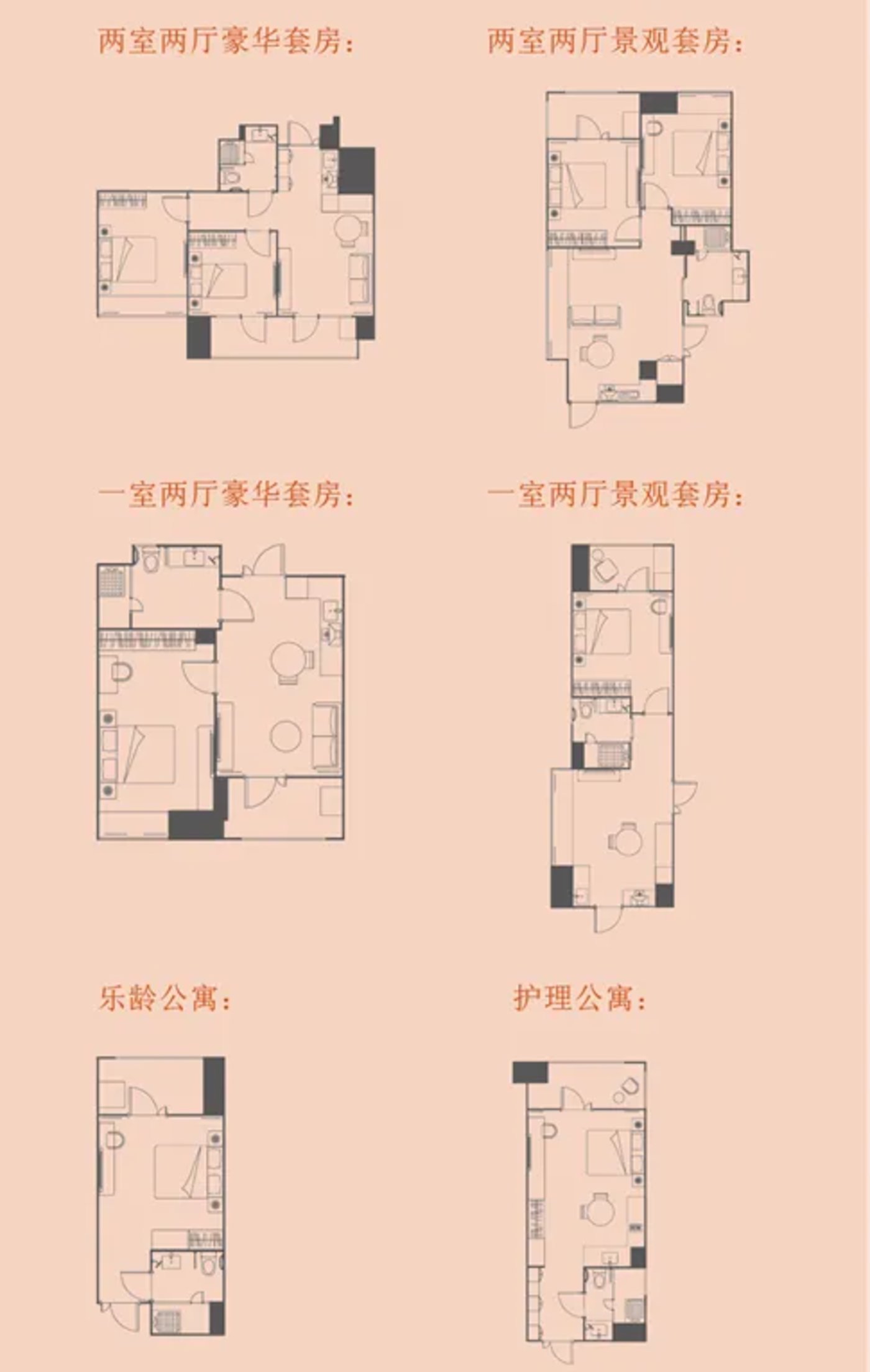 就拿前文提到的杭州湾达美庭乐龄公寓来讲,其公寓单元主要分为四种: