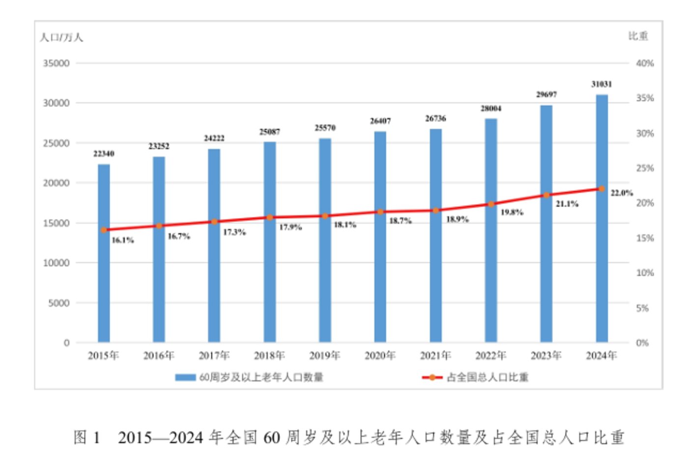 据 《2024 年度国家老龄事业发展公报》 显示,截至 2024 年末,全国 60 周岁及以上老年人口 31,031 万人,占总人口的 22.0%,较 2023 年增加 0.89%。
