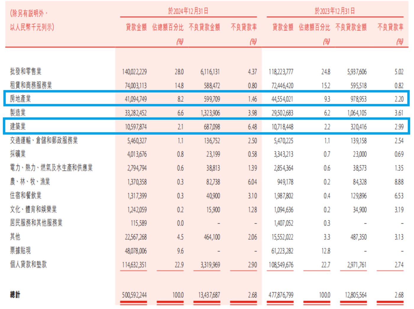 截至 2024 年 12 月末,盛京银行对房地产业的贷款投放约 411 亿元,占贷款总额的 8.2%,不良贷款率为 1.46%;对建筑业的贷款投放约 105.98 亿元,占贷款总额的 2.1%,不良贷款率为 6.48%,为该行贷款投放行业的最高不良贷款率。