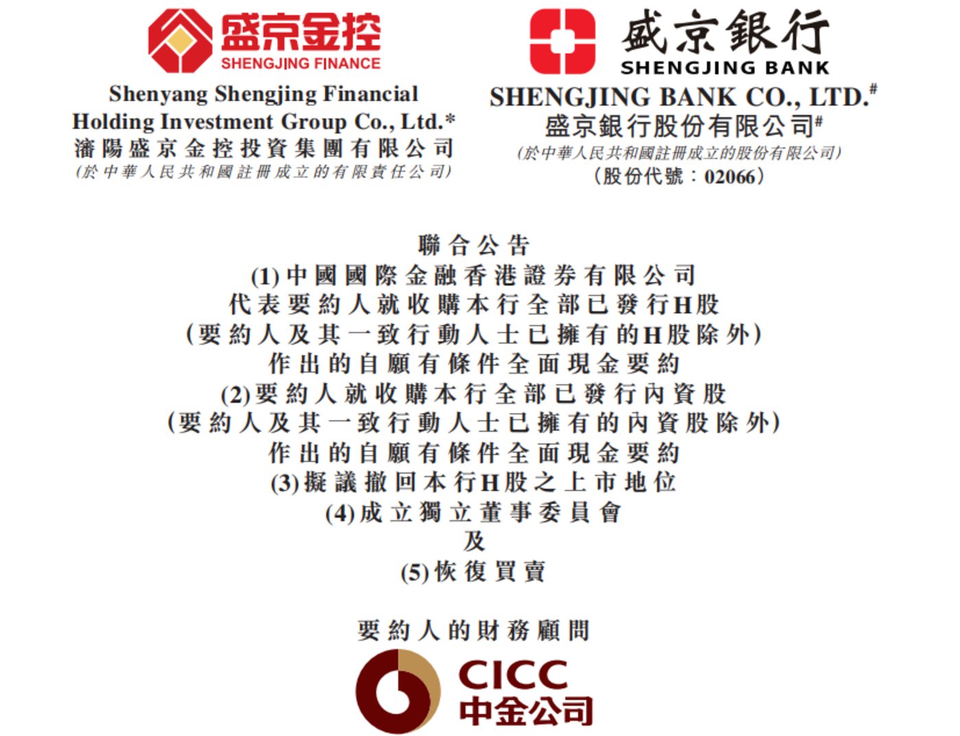 8 月 26 日晚,盛京银行发布公告,沈阳盛京金控投资集团 (下称 「盛京金控」) 及其一致行动人,发起现金要约收购盛京银行其余全部已发行 H 股及内资股。