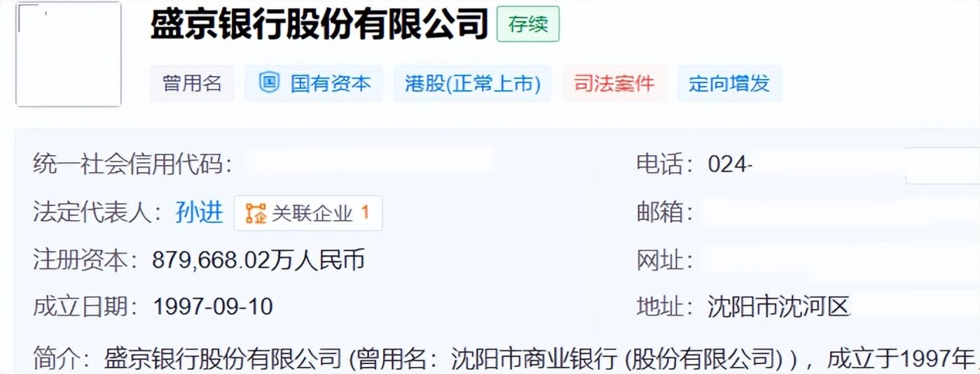 天眼查显示,盛京银行成立于 1997 年 9 月 10 日,注册资本 87.97 亿元,法定代表人孙进。盛京银行的前身是沈阳市商业银行,2007 年 2 月经中国银监会批准更名为现名,是沈阳市国有城市商业银行。
