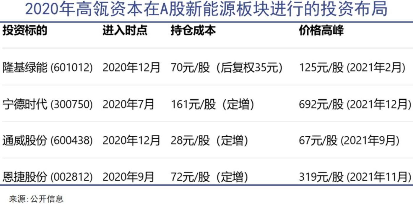 在不长的几年时间里,高瓴在新能源领域覆盖了光伏、锂电池、新能源汽车、氢能等核心子行业。在光伏赛道,高瓴不仅重仓了隆基绿能,还通过定向增发等方式,分别投入了通威股份、信义能源、协鑫科技等有差异化技术路线的光伏企业。
