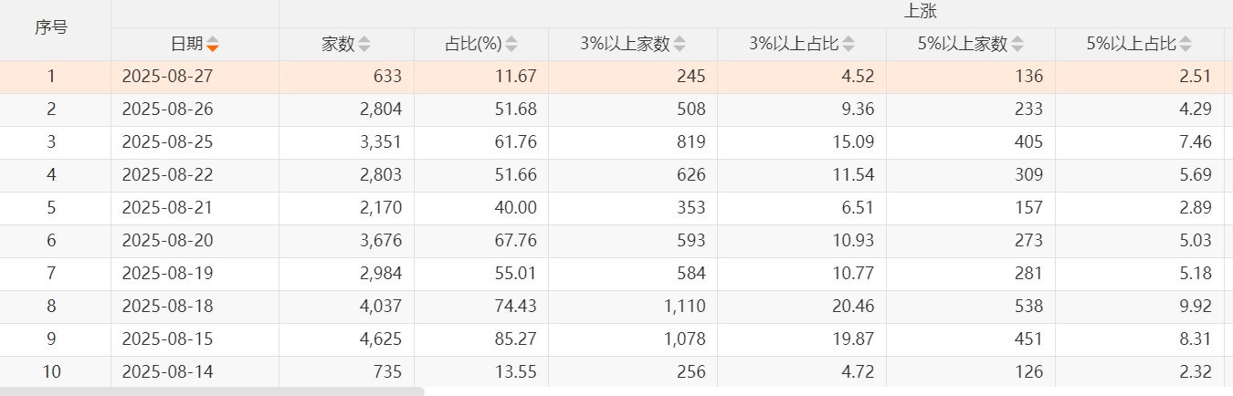 在 8 月 14 日至 8 月 27 日的 10 个交易日里,8 月 14 日、8 月 27 日,全市场均为不足 800 只个股上涨。其余交易日中只有 8 月 15 日有超过 85% 的个股上涨,大部分时候涨跌各半,加大了操作难度。