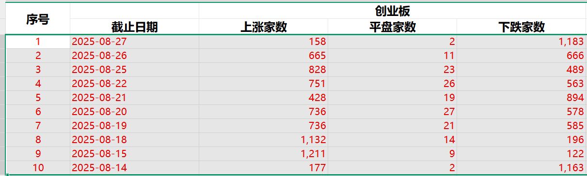 8 月 14 日至 27 日这十个交易日中,创业板只有 8 月 15 日、18 日下跌家数不足 200 家。8 月 27 日沪指尾盘跳水,当天创业板下跌家数多达 1183 家。