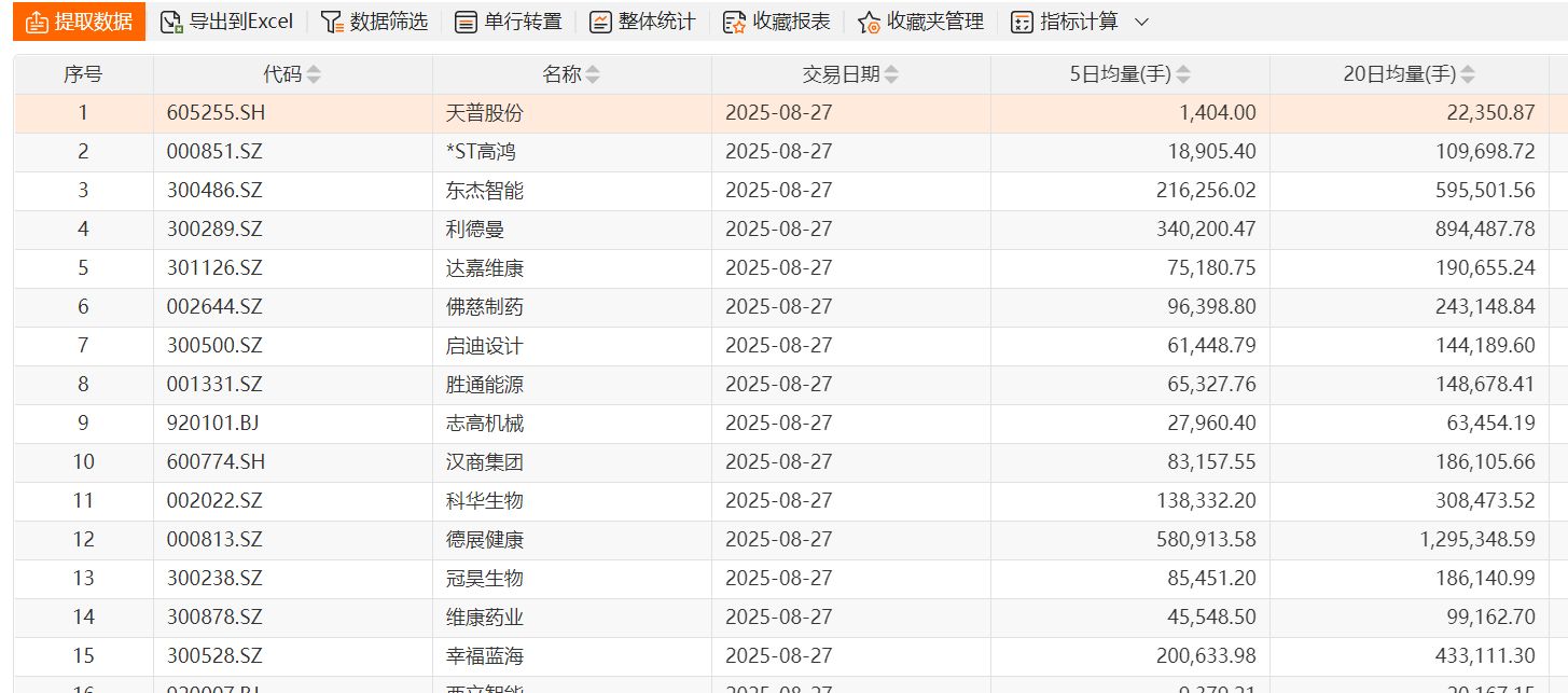 此外,东方财富 Choice 金融终端数据显示,截至 8 月 27 日,以 20 日均量和 5 日均量比较,有 284 只个股明显缩量,多数集中在中小创、北交所个股,如下图所示。