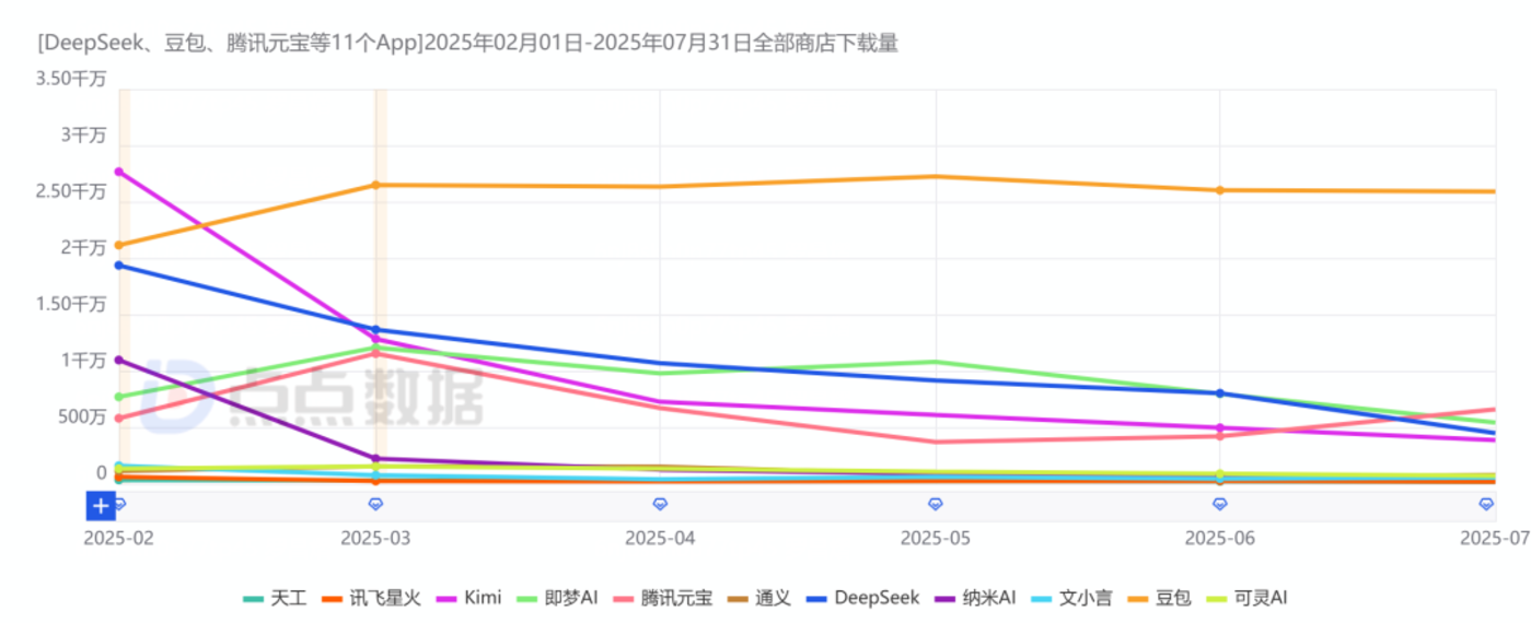 豆包、腾讯元宝等国产 AI 应用近半年月下载量趋势. 点点数据