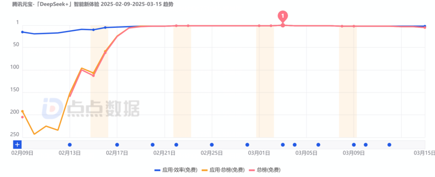 腾讯元宝 2 月-3 月免费榜排名趋势. 点点数据