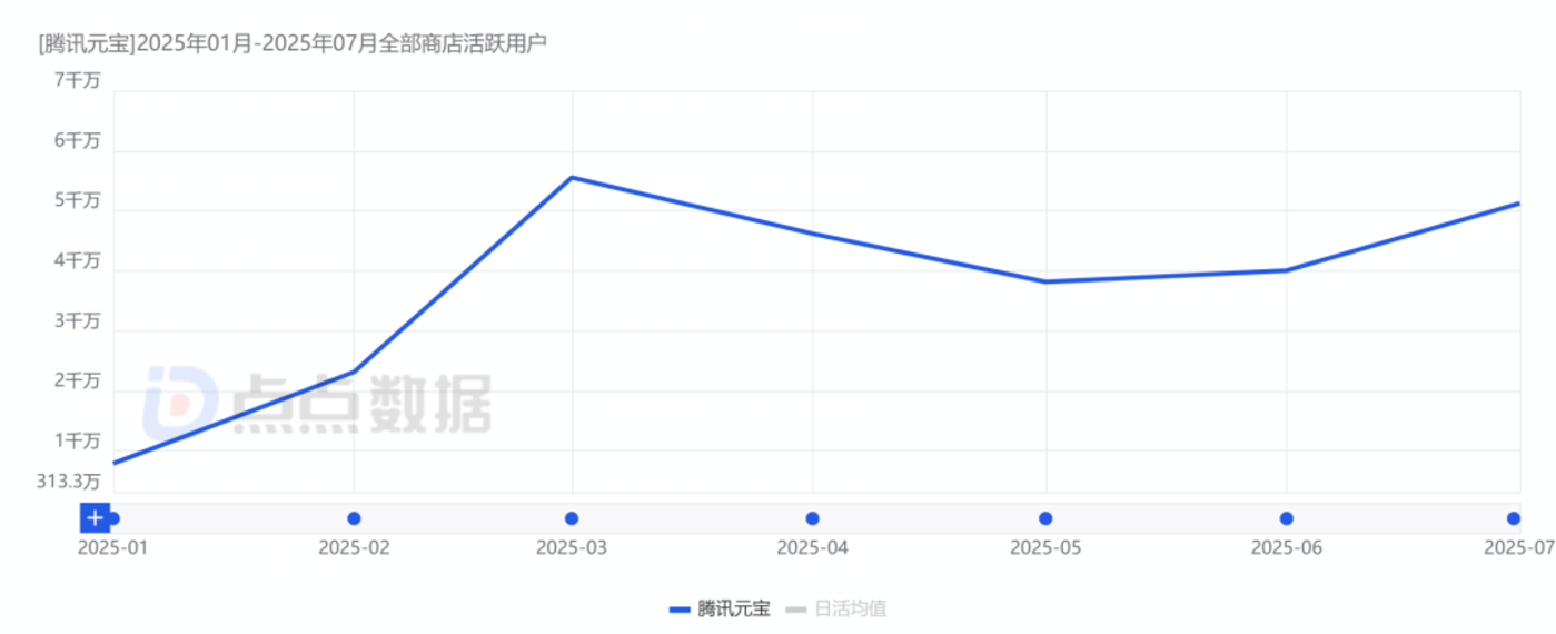 腾讯元宝 2025 年至今月活用户趋势. 点点数据