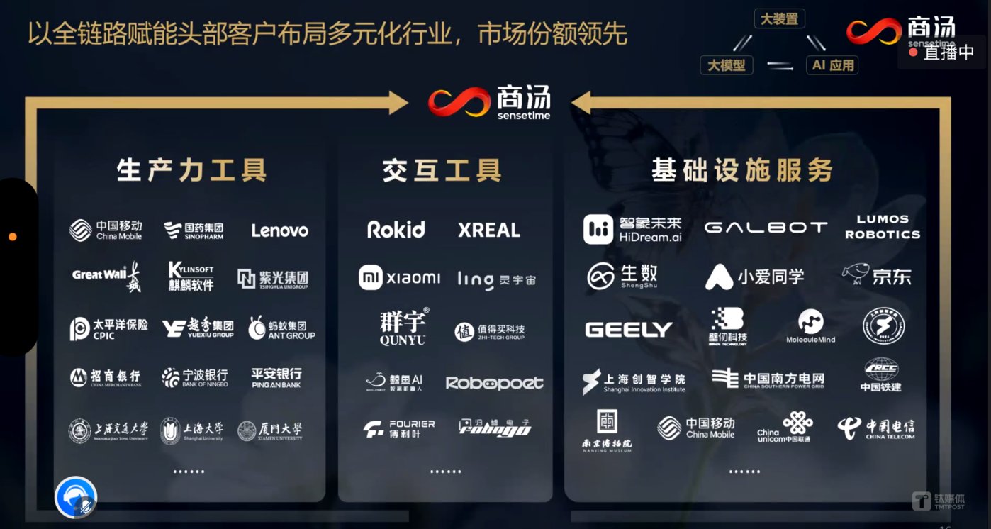 目前,小米的小爱同学、京东、壁仞科技、银河通用、鹿明机器人、生数科技、吉利、中国移动、中国联通、中国电信等多个头部客户都在使用商汤 AI 基础设施服务。