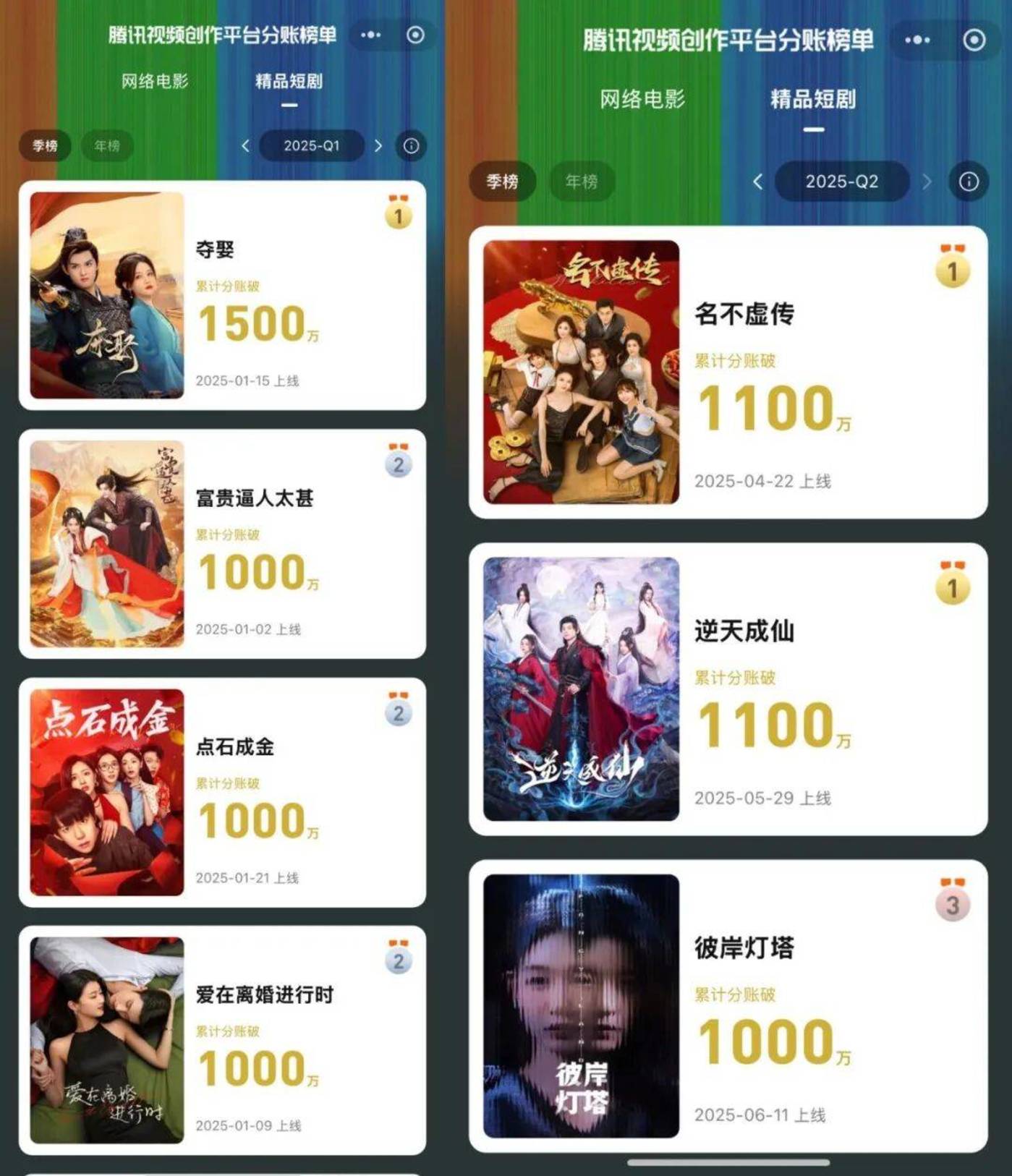 根据云合数据发布的 2025 上半年精品短剧票房榜单,腾讯视频一家平台就有 34 部短剧分账票房破百万,占全平台已公布成绩的 80%;其中破千万级别项目更是腾讯视频独揽,包揽榜单前 13 位。