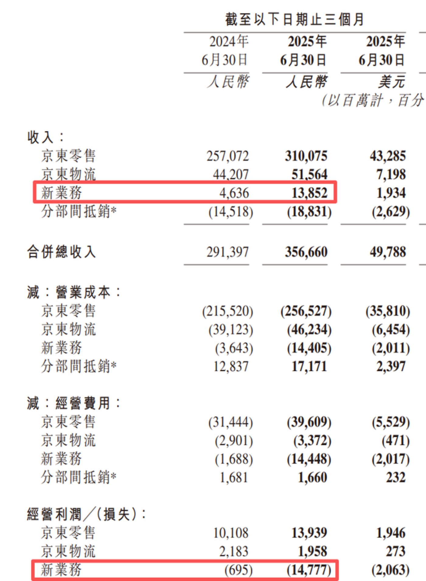 2024 年第二季度,还没有京东外卖,京东新业务的营收和经营亏损分别是 46.36 亿元、6.95 亿元;2025 年第二季度,京东新业务的营收和经营亏损分别是 138.52 亿元、147.77 亿元。