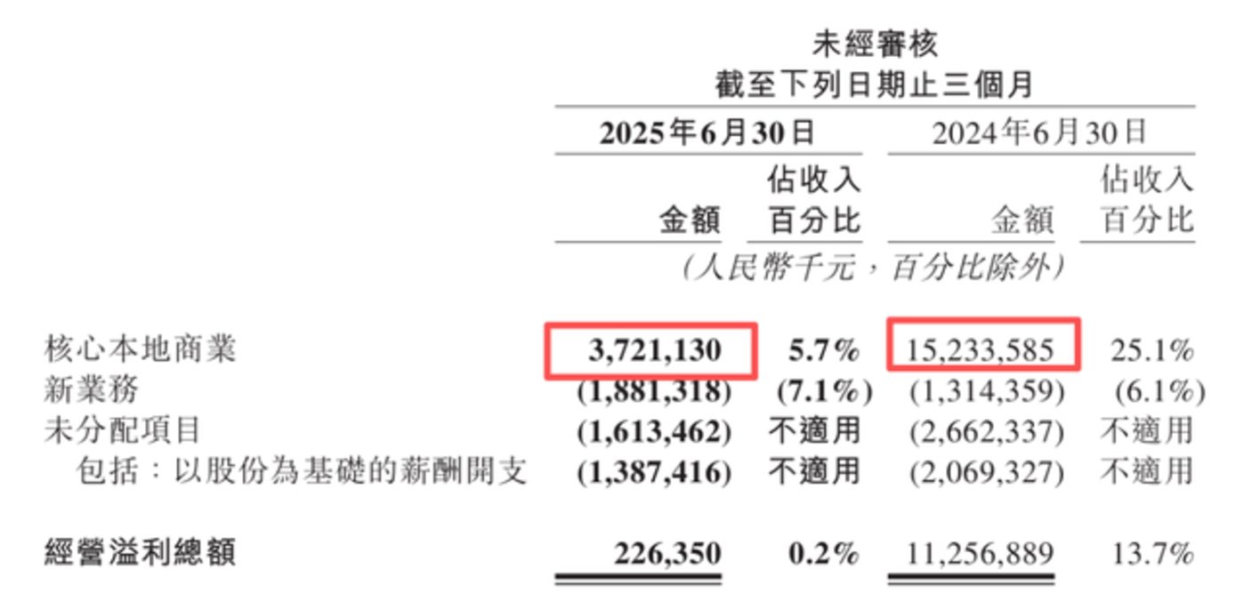 2024 年第二季度,没有外卖大战,美团核心本地商业的营收和经营利润分别为:606.82 亿元、152.34 亿元;2025 年第二季度,美团核心本地商业的营收和经营利润分别为:653.47 亿元、37.21 亿元。
