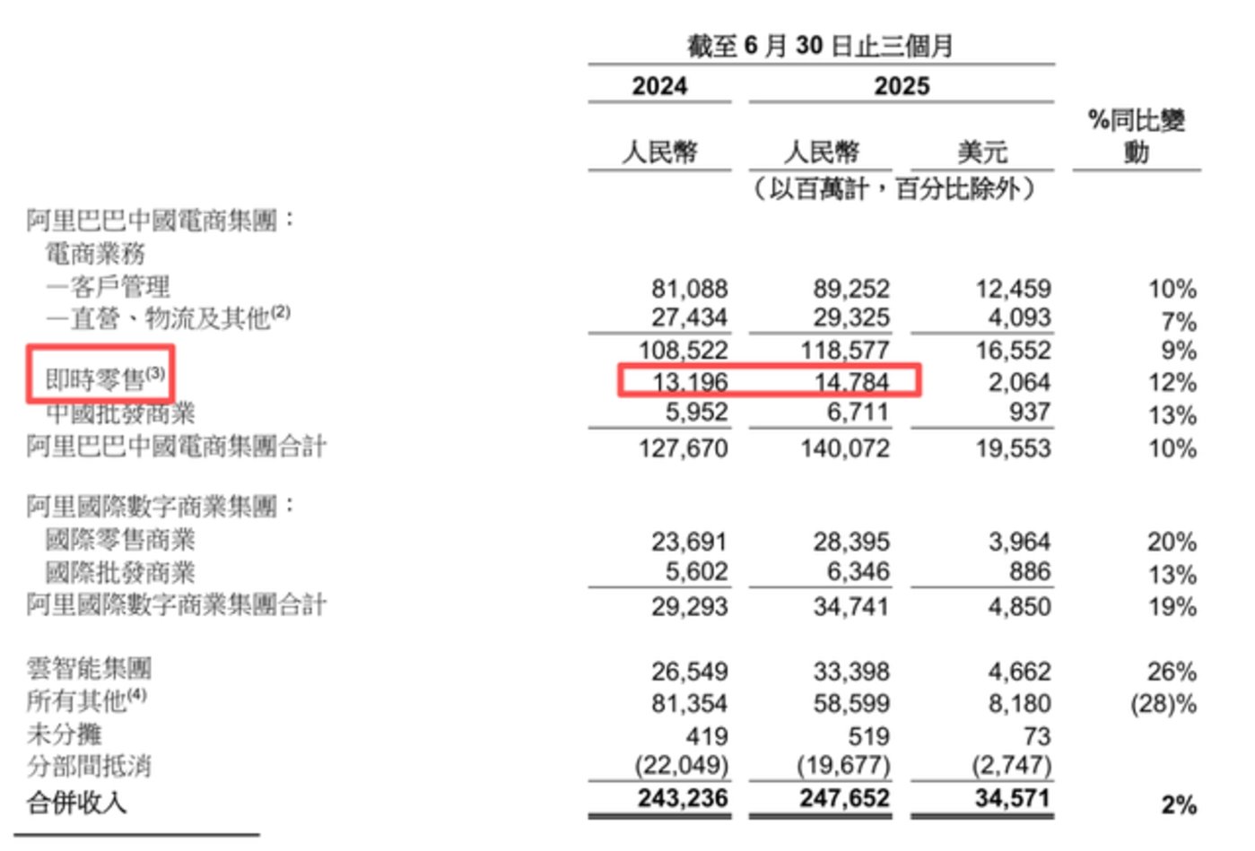 2024 年第二季度,阿里即时零售的营收是 131.96 亿元;2025 年第二季度,阿里即时零售的营收是 147.84 亿元。