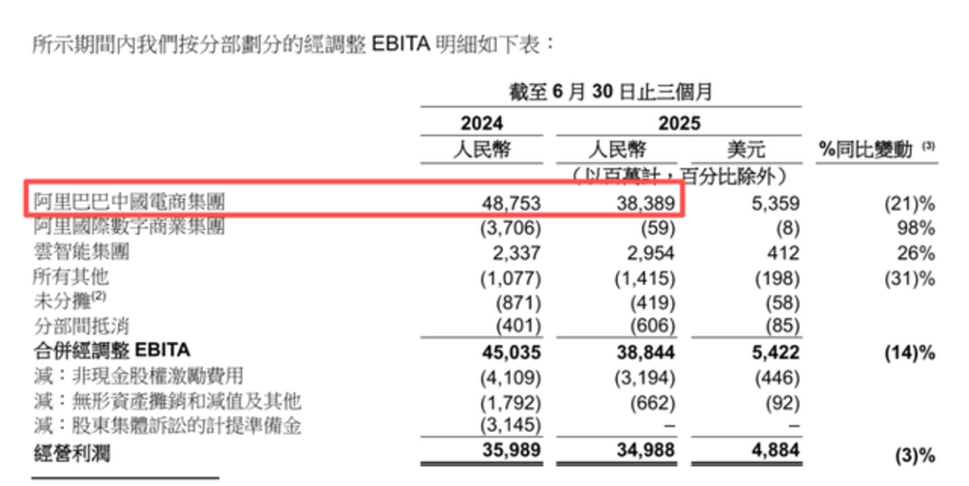 财报显示,即时零售所在的中国电商分部,2024 年第二季度和 2025 年第二季度的经调整 EBITA(息税摊销前利润,与经营利润接近) 分别为 487.53 亿元、383.89 亿元。