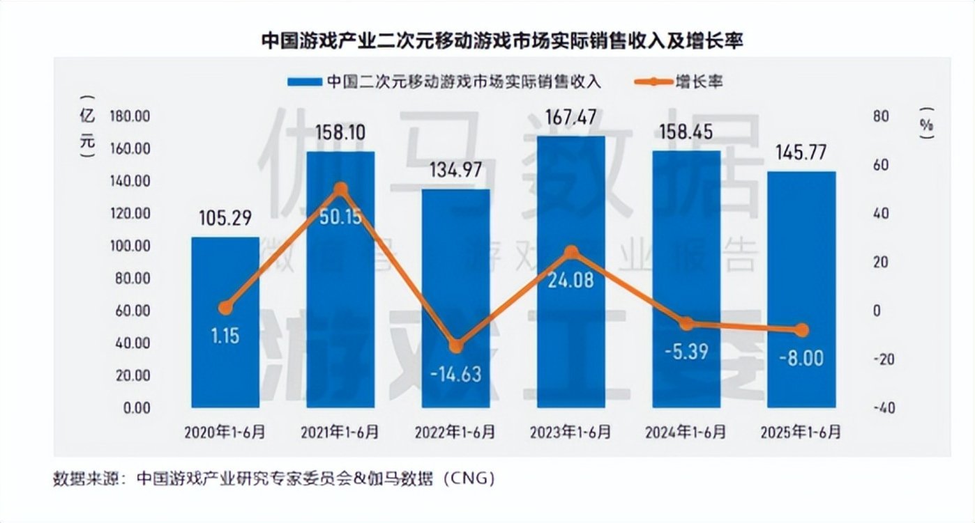 根据 2025 年产业报告,上半年二游移动游戏市场实际销售收入同比下降 8%,继续延续此前二游大盘下滑的趋势。
