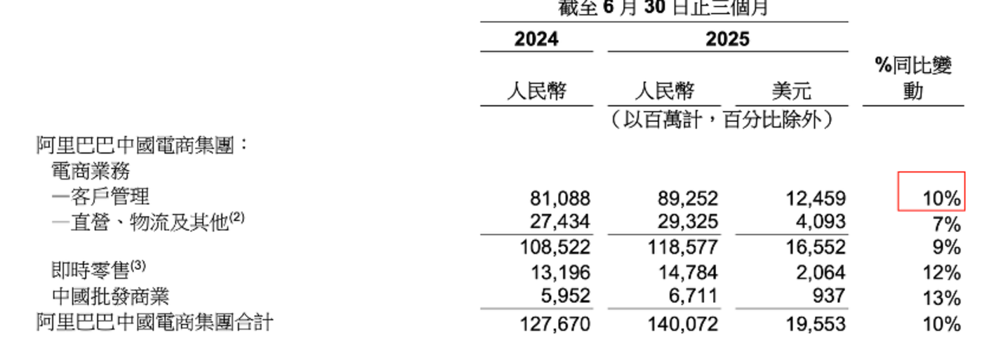尽管该季度淘宝闪购成为最焦点业务,但我们仍然不能忽视阿里电商最基石的电商业绩,本季度淘天客户管理收入同比增长 10%,达到 892 亿元,对比之下上年同期该业务同比增速仅有 1%。