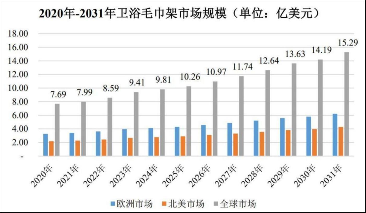 除用于家庭住宅领域外,卫浴毛巾架产品还广泛应用于泳池房、桑拿房、游艇、酒店、健身房和其他体育设施等商业领域。根据 KBV Research 的研究报告,卫浴毛巾架产品的市场规模从 2020 年的 7.69 亿美元增长到 2024 年的 9.81 亿美元。预计到 2031 年,其市场规模将达到 15.29 亿美元,其中欧洲市场占比 40.65%。