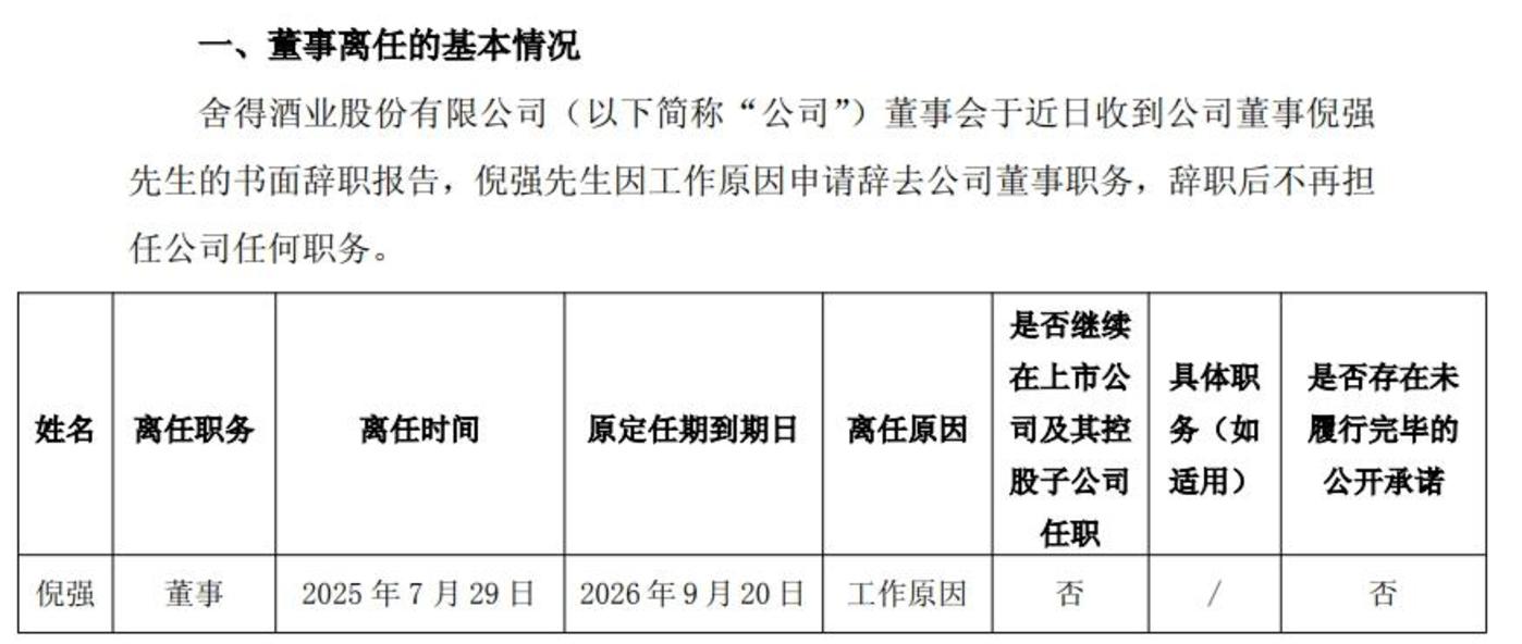7 月 29 日,舍得酒业发布公告称,倪强因工作原因申请辞去公司董事职务,辞职后不再担任公司任何职务。其原定任期本应至 2026 年 9 月 20 日结束,这一提前离职再次引发了市场的诸多猜测。