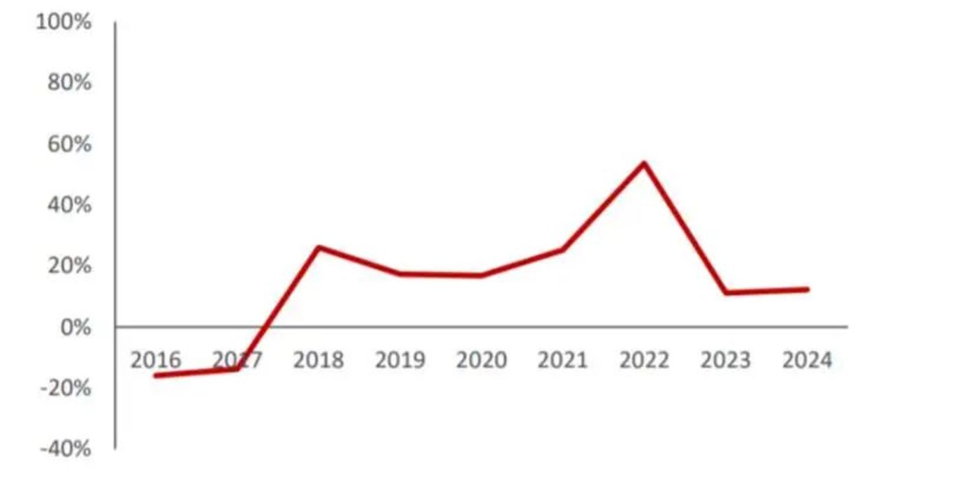 从 2018 年开始,中国化工行业开始了一轮轰轰烈烈的产能大扩张。从在建工程投资总额看,2018 年到 2024 年年均保持正增长。2024 年更是达到了 3884 亿元,同比增长 12.3%,但比 2022 年的 50% 以上要慢一些了。2025 年一季度则自 2018 年以来首次落入了负数区间。
