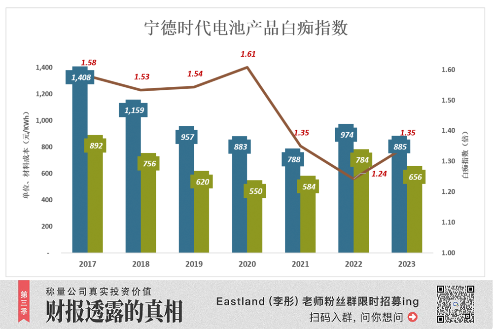 2019 年,宁德时代电池系统 (动力电池、储能电池) 出货价为 957 元/KWh,原材料成本为 620 元/KWh。「白痴指数」 为 1.54 倍。
