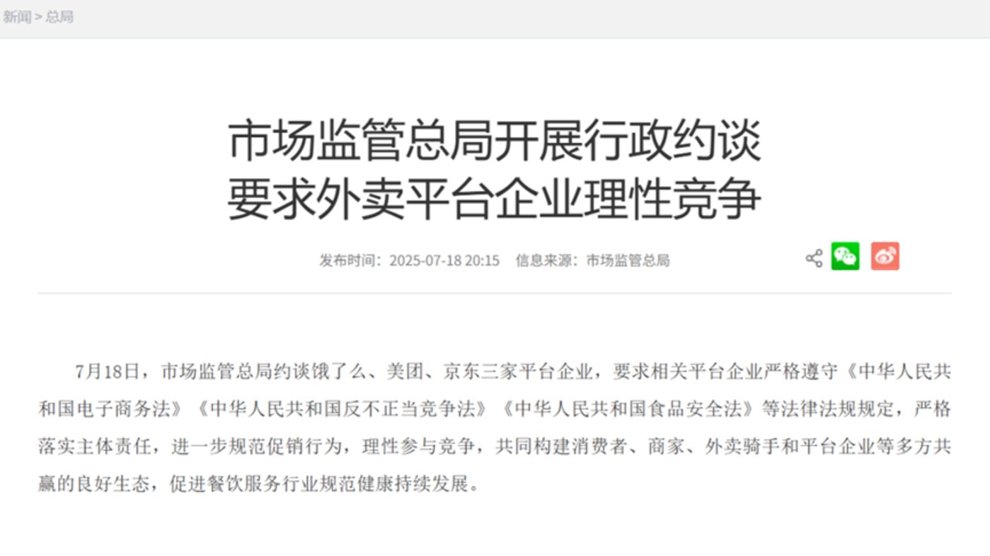 由于外卖平台的竞争异常激烈,严重扰乱了正常的商业秩序,有关部门已开始加强监管。2025 年 7 月 18 日,市场监管总局约谈饿了么、美团、京东,要求各平台规范促销行为,理性参与竞争,共同构建消费者、商家、外卖骑手和平台企业等多方共赢的良好生态,促进餐饮服务行业规范健康持续发展。