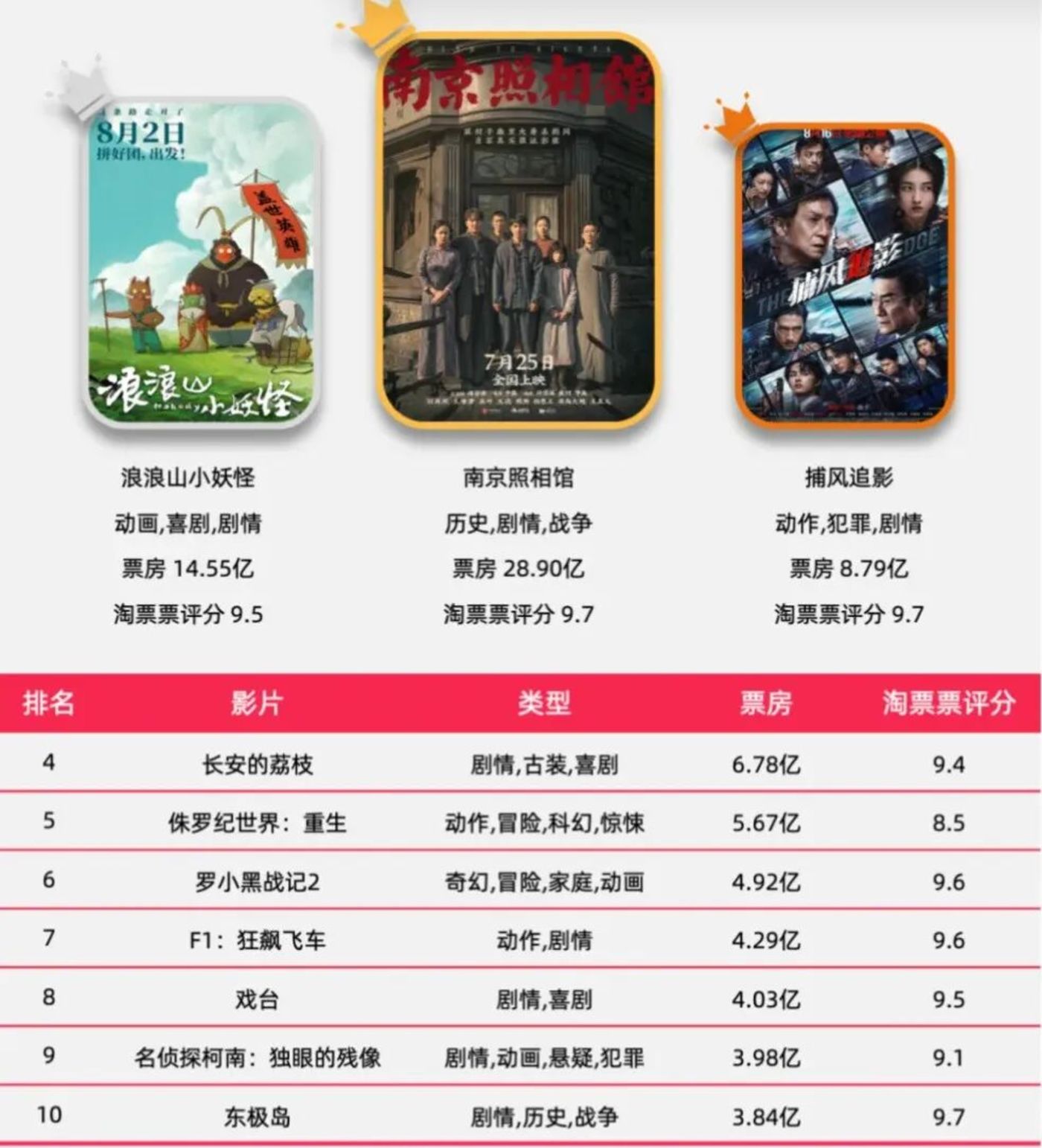 今年暑期档票房 TOP10 影片中,豆瓣评分 8 分以上的达到 6 部,包含 《南京照相馆》《浪浪山小妖怪》《捕风追影》《罗小黑战记 2》《F1:狂飙飞车》《戏台》,其中仅有一部进口片,这个比重可以说相当权威。此外,TOP10 影片中 《长安的荔枝》 豆瓣评分为 7.6 分,也称得上佳作,客观而言,暑期档票房 TOP10 行列的国产片中,质量不佳的仅有 《东极岛》。