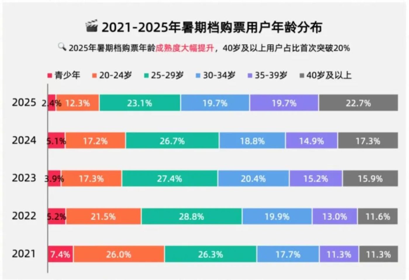 在这一过程中,电影市场仍处于相对不稳定的调整期,《2025 暑期档电影市场洞察报告》 显示,今年暑期档观影用户年龄分布加速成熟化,40 岁及以上观众占比首次突破 20%,同时 《2025 暑期档数据洞察》 也提到 2025 新用户较往年相对年长。除了爆款拉新后留存难,新用户呈现出新的年龄结构特征,今年暑期档还有一个关键趋势,那就是社交属性的弱化。