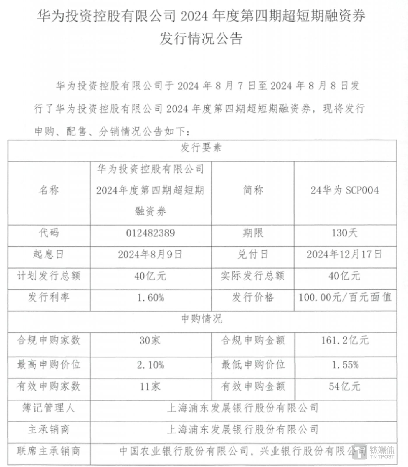 8 月 12 日,华为投资控股有限公司发布公告,日前完成发行 2024 年度第四期超短期融资券。本期债券简称 「24 华为 SCP004」,发行金额 40 亿元,利率 1.6%,期限 130 天,起息日为 2024 年 8 月 9 日,兑付日为 2024 年 12 月 17 日。