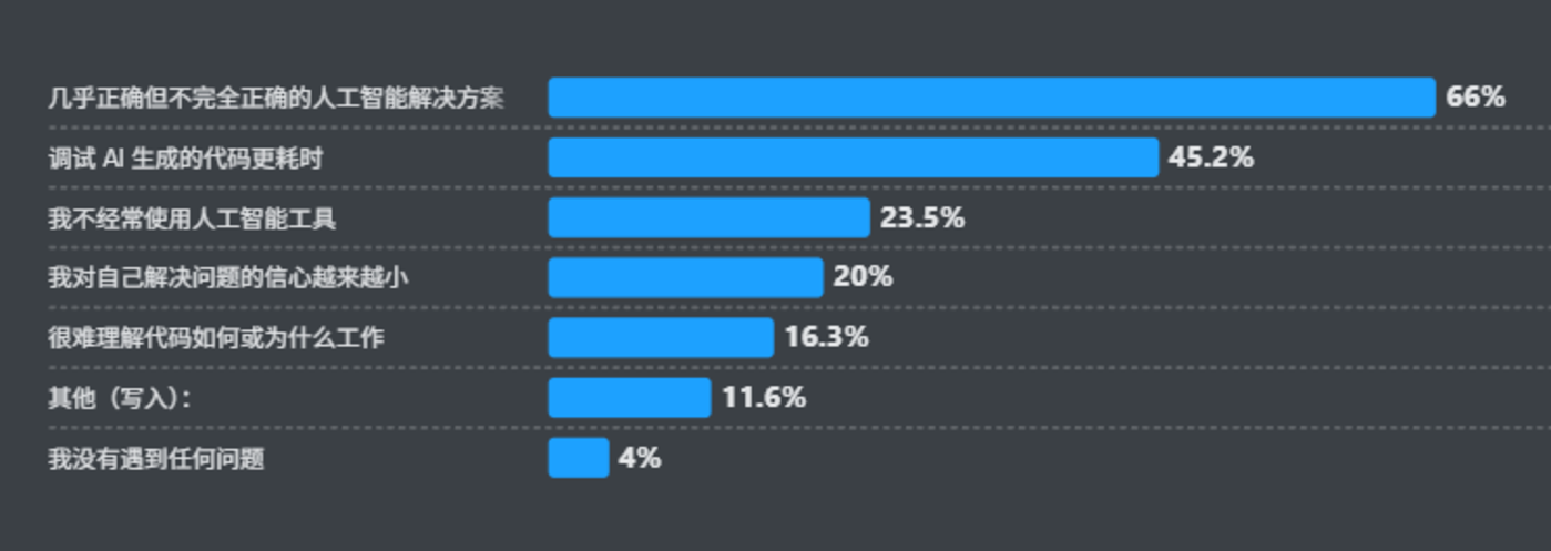 Meta、微软等巨头裁员潮中,70% 被裁的是初级程序员,面对这种生存威胁,开发者即便明知 Vibe Coding 生成的是技术债务,也不得不转向 Vibe Coding 等工具寻求自保。数据显示,程序员对 AI 的好感度,从 2023 年的 77% 下降到 2024 年的 72%,今年更是仅为 60%,折射出开发者们 「不用怕落后,用了怕被坑」 的矛盾心态。