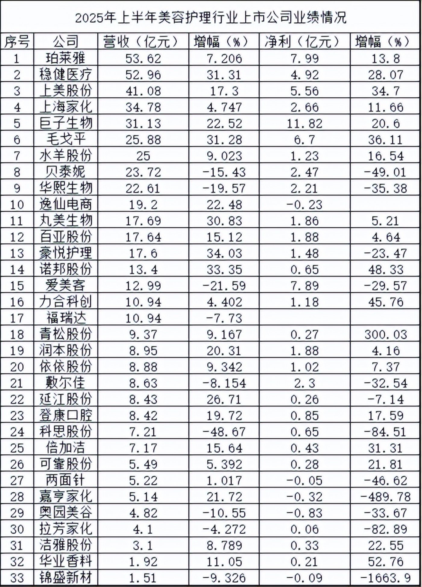 综合各大美容护理上市公司 2025 年上半年财报,从营收来看,珀莱雅、稳健医疗、上美股份、上海家化、巨子生物、毛戈平、水羊股份、贝泰妮、华熙生物、逸仙电商位居前十强。