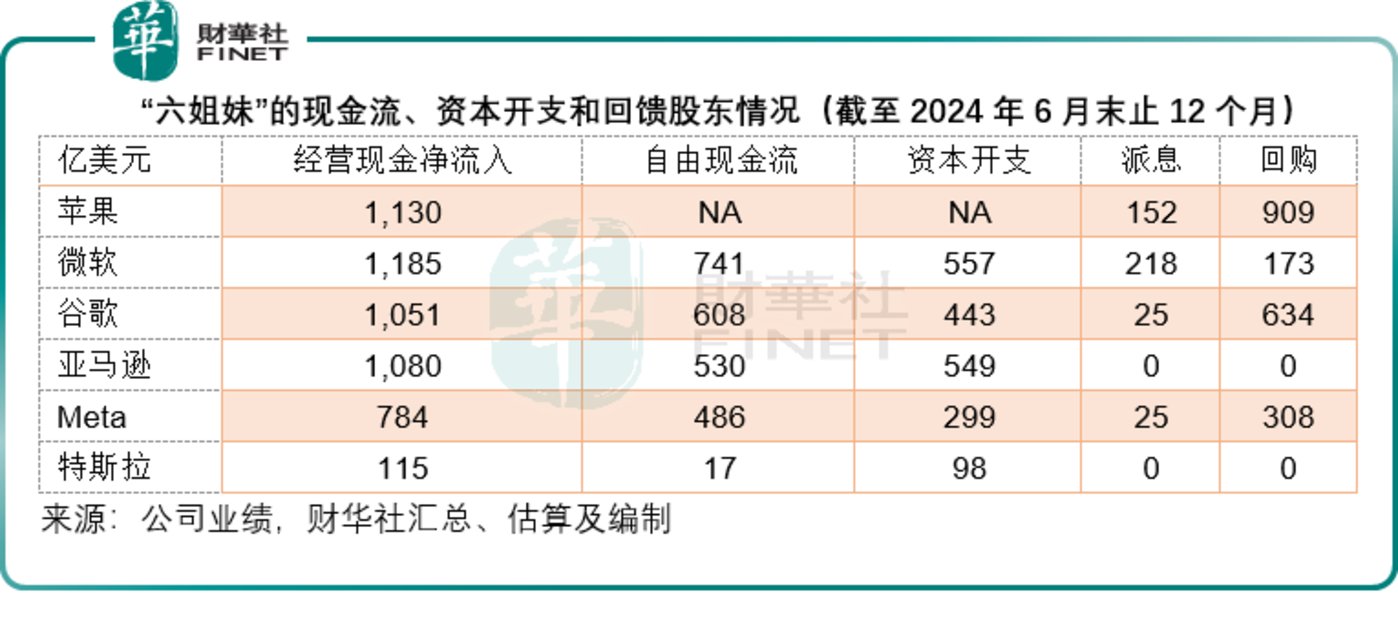 在高利率环境下,项目的回报要求也相应提高,「六姐妹」 如何使用这些现金?从其 6 月财季业绩来看,「六姐妹」 都倾向于将自由现金流用于回馈股东和投资 AI,这也是华尔街日益担心 AI 投资过剩,项目回报或不如预期的原因。