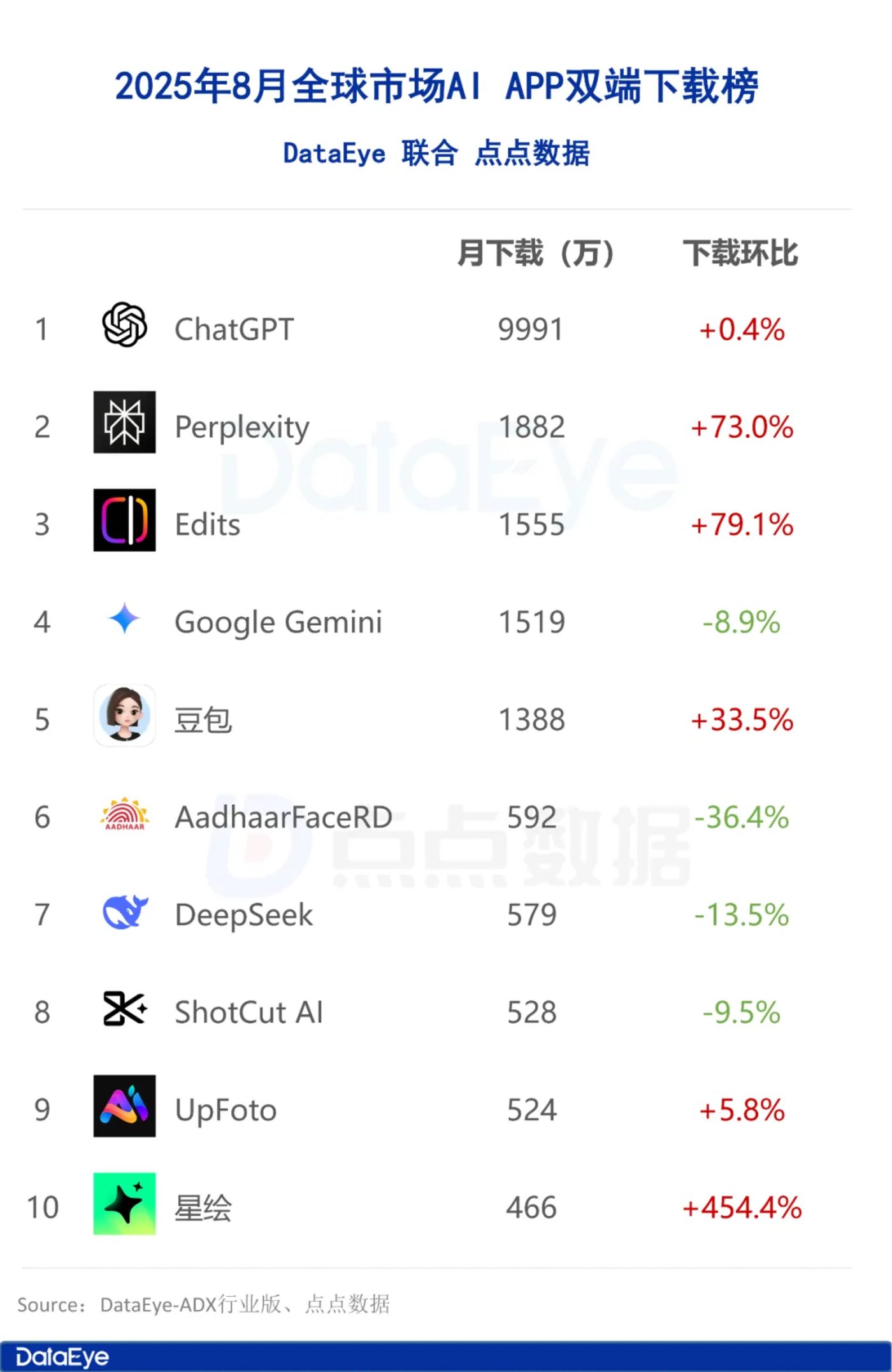 同时,Google Gemini 和豆包分别由 7 月份第二和第四滑落至 8 月份第四和第五位,Perplexity 则由 7 月份第三晋升至 8 月份第二位,7 月份位列第五的 AadhaarFaceRD 跌出 8 月份 TOP 5,取而代之的是 Instagram 推出的 Edits 跻身 8 月份第三位。