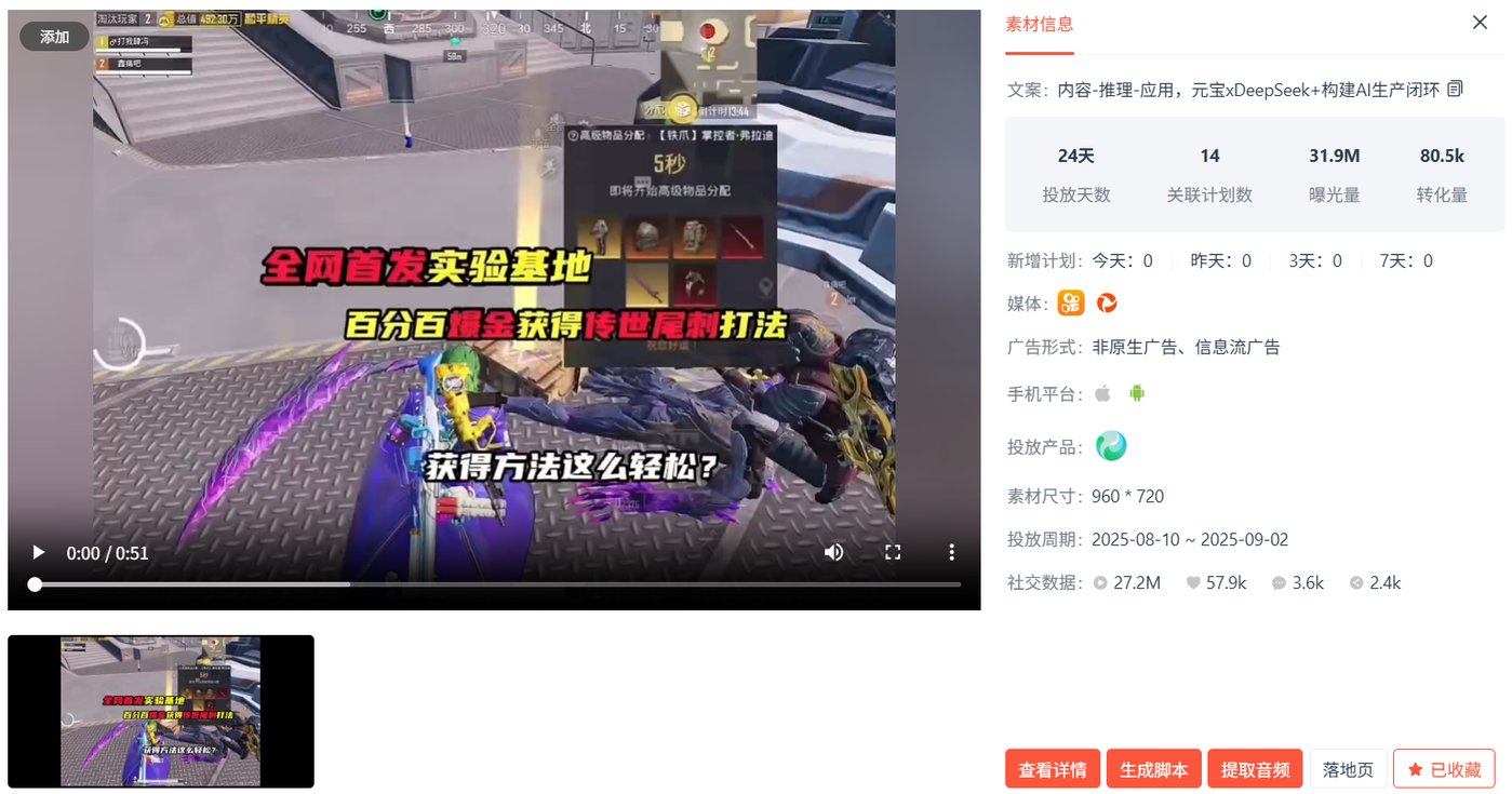本条素材是腾讯元宝在 2025 年 8 月份的新增高曝光视频素材,曝光量 3190 万,转化量 8.05 万。