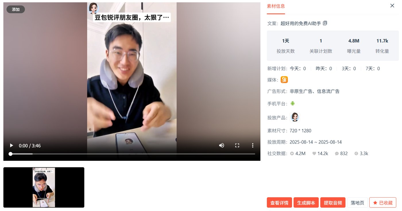 本条素材是豆包在 2025 年 8 月份的新增高曝光视频素材,曝光量 480 万,转化量 1.17 万。