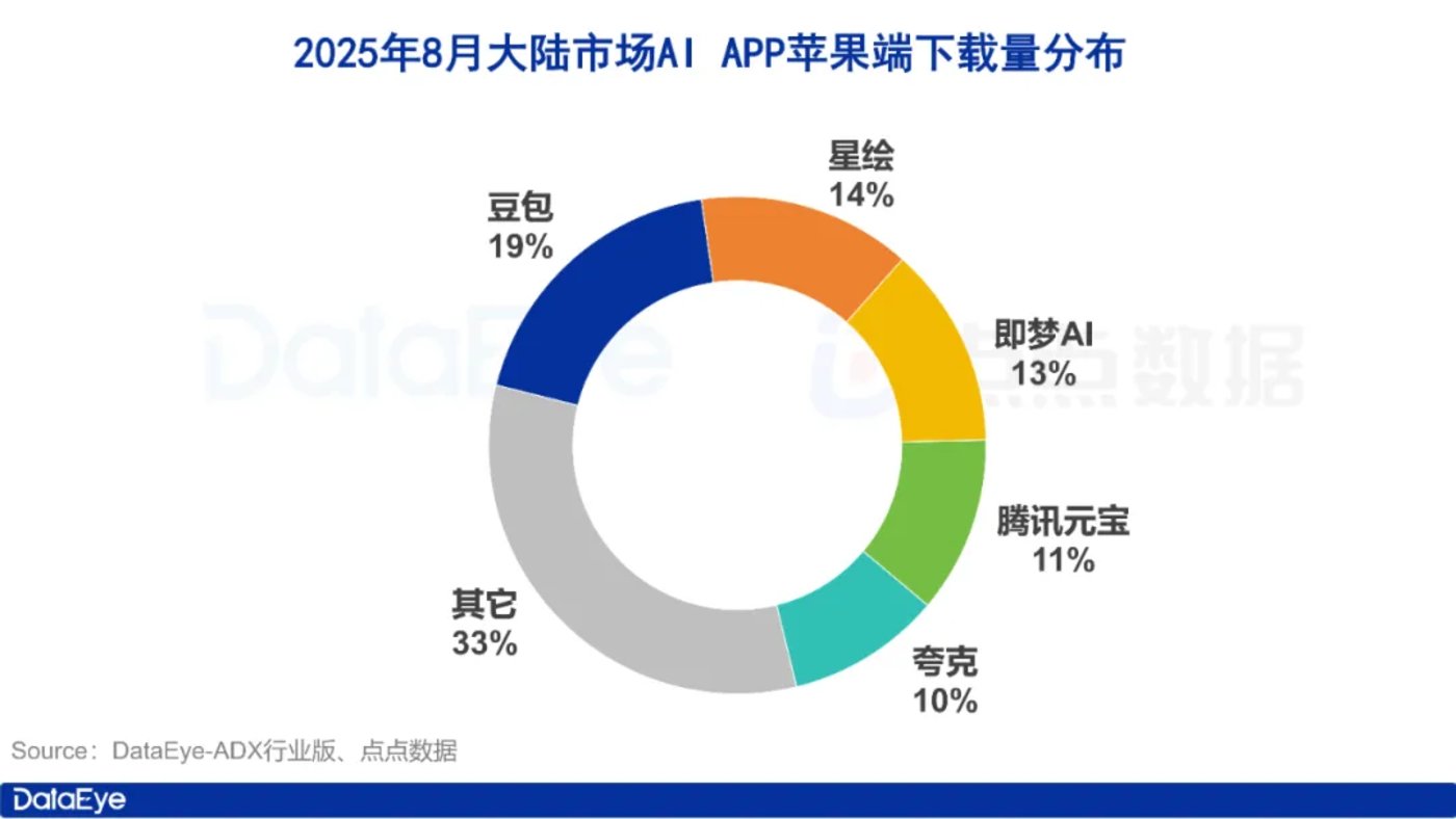 值得注意的是,7 月份位列第五位的 DeepSeek 跌出了 8 月份 TOP 5,取而代之的是字节旗下星绘跻身 8 月份第二位,下载量占比达 14%。