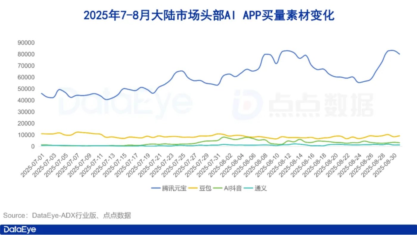 ADX 行业版数据显示,2025 年 8 月,大陆市场头部 AI APP 买量素材呈明显分化格局,腾讯元宝投放素材量持续走高,豆包、AI 抖音与通义保持相对较低水平。