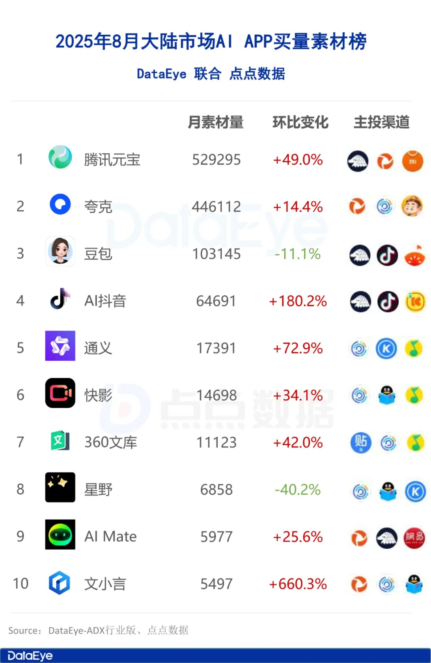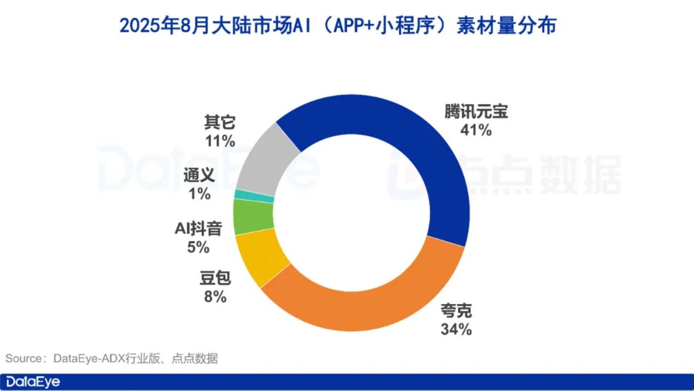 其中,腾讯元宝、夸克、豆包、AI 抖音与通义位列素材投放榜 TOP 5,这 5 款应用占据了大陆市场 AI 行业月投放素材量的 89%。