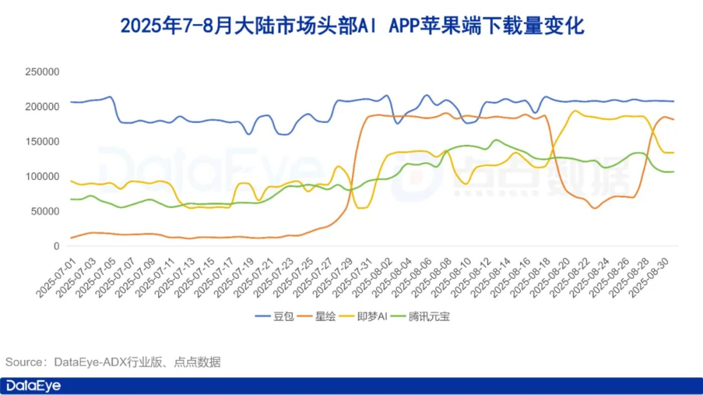 点点数据显示,2025 年 7 月至 8 月,大陆市场苹果端头部 AI APP 预估下载量,豆包依旧保持领先,但其它几款产品下载量均大幅提升。