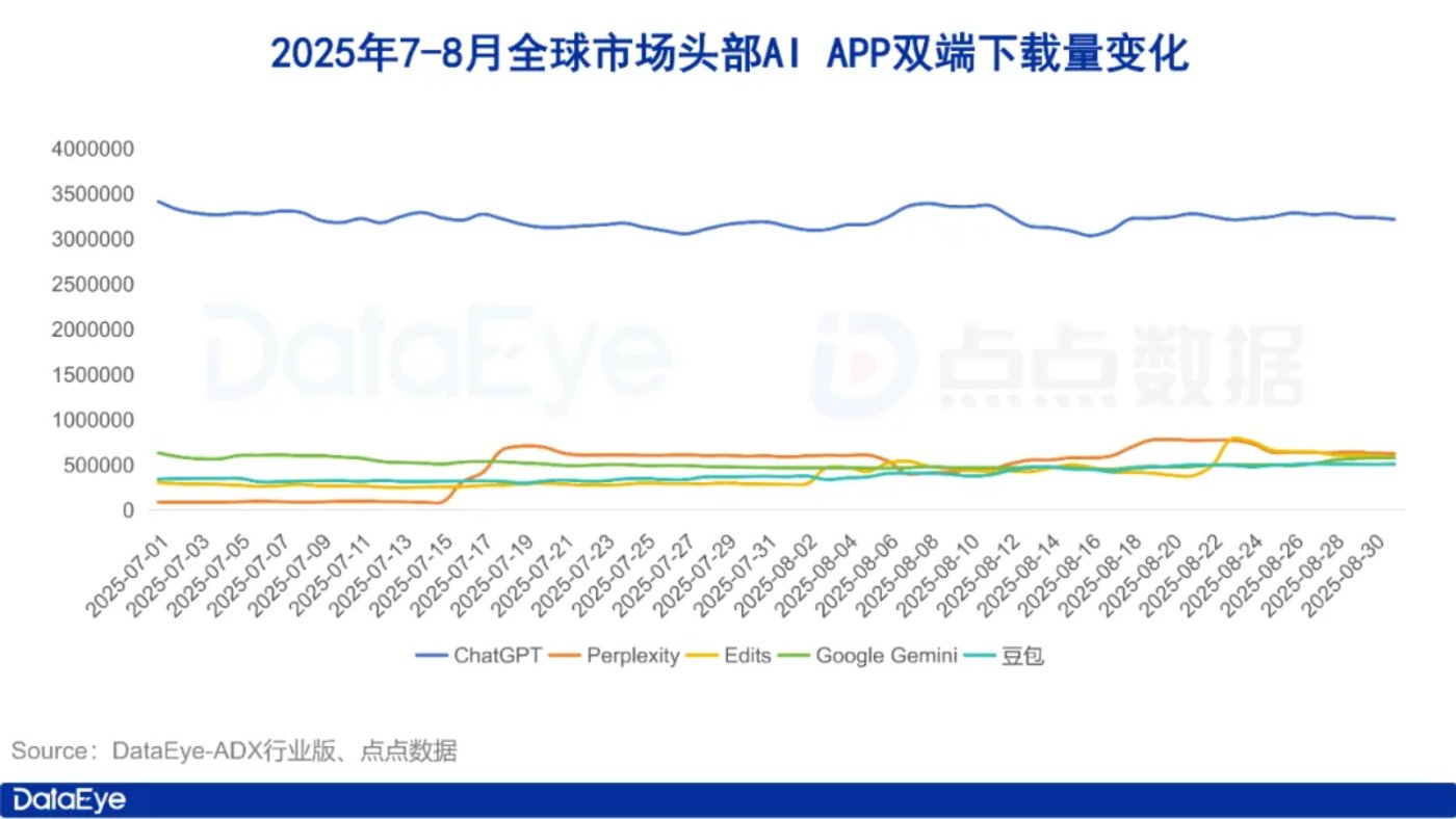 点点数据显示,2025 年 7 月至 8 月,全球市场头部 AI APP 双端预估下载量,除 ChatGPT 依旧遥遥领先外,其余几款产品下载量差距逐步缩小。