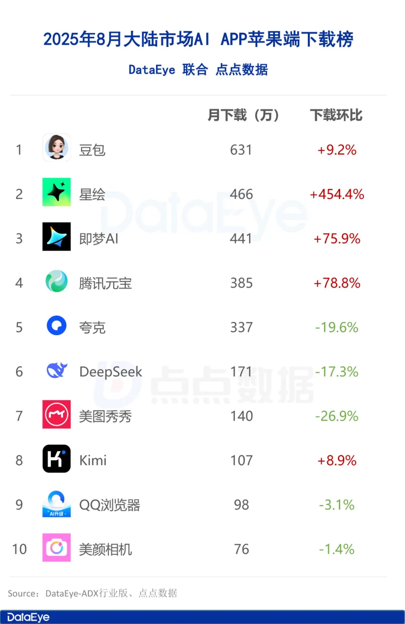 点点数据显示,2025 年 8 月大陆市场苹果端 AI APP 下载量榜单由豆包蝉联榜首,下载量 631 万次,环比 7 月上涨了 9.2%。星绘、即梦 AI 紧随其后,TOP 3 由字节旗下应用包揽。