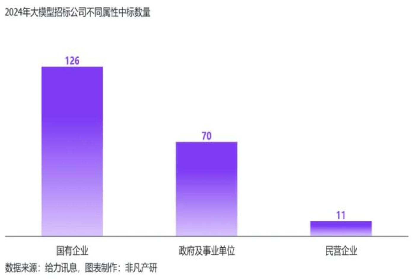 据给力讯息和非凡产研联合发布的 《2024 年上半年中国 AIGC 行业商情报告》 显示。2024 年上半年,大模型中标数量共计 207 个。其中,国有企业占据了主导地位,共计 126 家,较去年全年相比,上半年增长 110%。国有企业累计中标金额连续两年最高,2024 年上半年累计中标金额 3.7 亿元,涉及众多行业和领域,如能源、交通、通信、金融等。