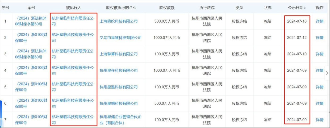 接下来发生的事实印证了上述人士的判断。2024 年 7 月初到 7 月中旬,王氏父子旗下与算力相关的核心子公司股权均被杭州市西湖区人民法院冻结。其中,星临科技在 7 家持股公司所持股权合计被冻结 3100 万元;星藏科技在三家参股公司的所持股权合计被冻结 2850 万元。