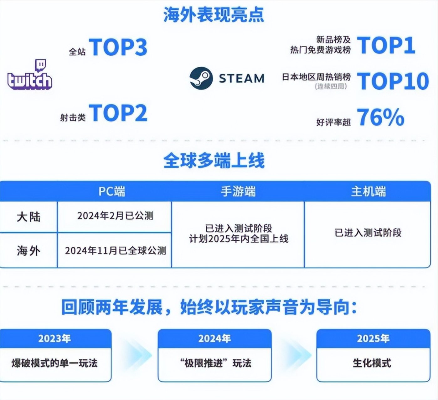 之前业绩会传达的产品信息都是围绕射击玩法的深度和平衡相关努力,一个典型的完善就是角色平衡控制,例如角色的平衡率保持在 48%-52% 之间,有赖于角色管线的大大改善,尤其是新角色的选角率也在大幅的提升等等。