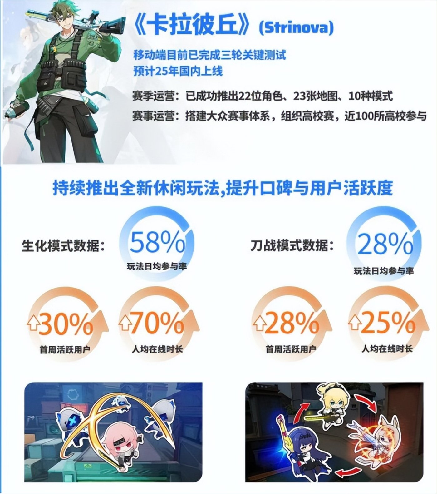 根据财报数据,生化模式玩法日均参与率 58%,首周活跃用户增长 30%,人均在线时长增长 70%;刀战模式玩法日均参与率 28%,首周活跃用户提升 28%,人均在线时长提升 25%。
