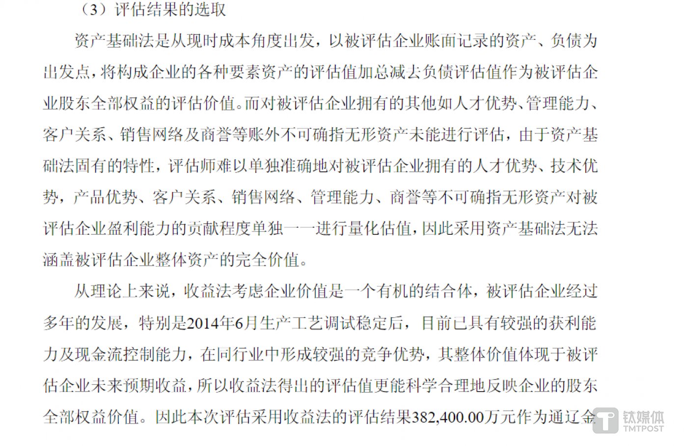 钛媒体 APP 注意到,在当时的资产评估报告中,丹化科技采用资产评估法对通辽金煤的总价值为 35.24 亿元,采用收益法的评估结果为 38.24 亿元,增值率为 145.99%,最终公司采用收益法作为评估结论。而对于为何选用收益法,公司做出了相关解释,但未对未来收益预测作出谨慎性说明。